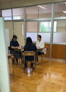 生徒さんお二人とキャリアコンサルタント1人のグループセッション。インターンシップを経験して、どのような事をしたのか、どう感じたのか、何を思ったのか、友達の発言を聞いてどう思ったか等、様々な思いを言語化して共有いただきました。